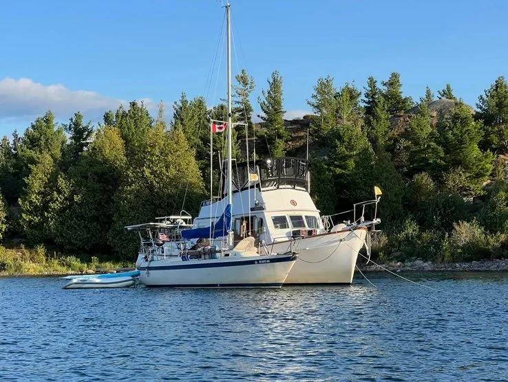 Unfortunately around the time we crossed to Canada was the time many things on the boat started breaking, despite being brand new at the start of our journey. An auto life jacket inflated in the cabin, rendering it useless. The refrigerator plug melted in its socket. Our Starlink dish failed. Our bilge pump hose fitting snapped. Our Honda outboard developed a new problem to add to the pile, but this one quite concerning: no coolant water was coming out the side. A friendly local couple delivered an outboard stand so we could lift the motor and work on the problem. After days stuck in the marina, hours of work and $200 in scarcely available parts, the problem persisted. More research suggested we clean the passage using weed trimmer line (which the Canadians charmingly call “whippersnipper” line). Our problem was gone.