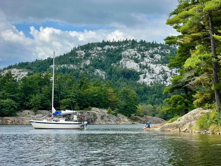 One night we found ourselves anchored in a gorgeous cove divided from the expanse of Georgian Bay by only a chain of low-lying rocks. After a peaceful night’s sleep, we awoke to the sound of the wind howling through our rigging - a forecasted low pressure system had arrived a day early. On the other side of our glassy cove were waves breaking against the rocks, sending spray into the air. With high winds expected to last for days and Meriah’s parents arriving for a visit soon, we had little choice but to head into the bay. We raised a reefed main and motored out between the rocks. Thankfully we were only 5 miles from safe harbor, so we crashed into the oncoming waves for an hour until we were perfectly lined up with the Killarney inlet, then turned hard and surfed the steep 3’ waves into the narrow rocky channel. Early in the Loop, our hearts would be racing, but we are growing accustomed to more and more challenging conditions.