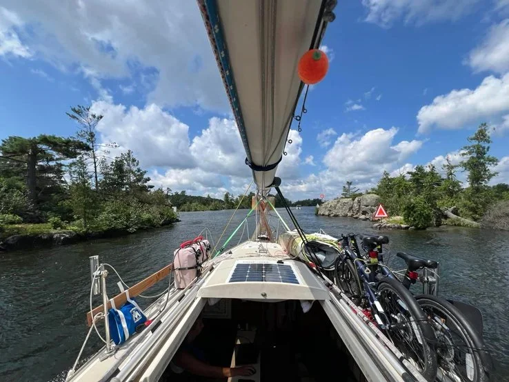 We can verify the stereotype of Canadian courtesy is mostly true, and we met many kind boaters along the way who helped us stay on track with our journey, invited us on to their boat for pie, or offered advice on must-stop places. All of this goodwill was offered despite the shabby appearance of Novella during this stretch, which Meriah aptly dubbed the “garbage barge”. The mast was still strapped to a wooden cradle on deck, and due to our thriftiness it was soon joined by Puff, our dinghy, rolled up with the crusty barnacle side out. (We usually tow Puff but we were going to be charged an extra fee in the Trent.) Our folding bikes joined the party on deck so we could easily pedal around the towns each day. At a marina near the end, a woman sheepishly asked Meriah if our boat was “the one with all the stuff on it”.