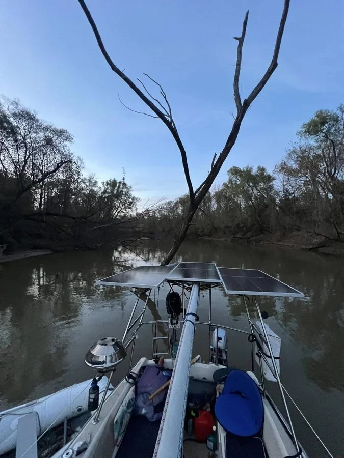 Today we saw wild pigs on the riverbank. At sundown we anchored off the river in a narrow creek and tied the stern to a fallen tree to keep the boat from swinging.